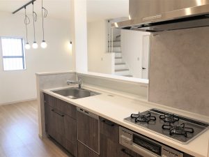 家族の時間を大切にする、効率的な家事動線。キッチン、洗面、浴室を近くに配置。