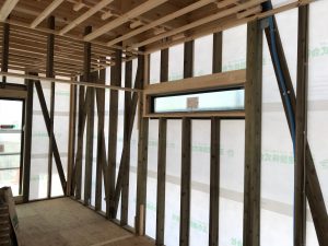 防水シートを貼り終わって、吹付け断熱材をこれから施工していきます。