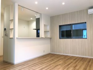 対面キッチンの上に間接照明を設置したオシャレな内観が魅力。あると便利な「洋風和室」や「玄関土間収納」も付いてます。