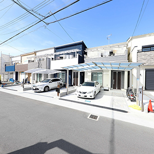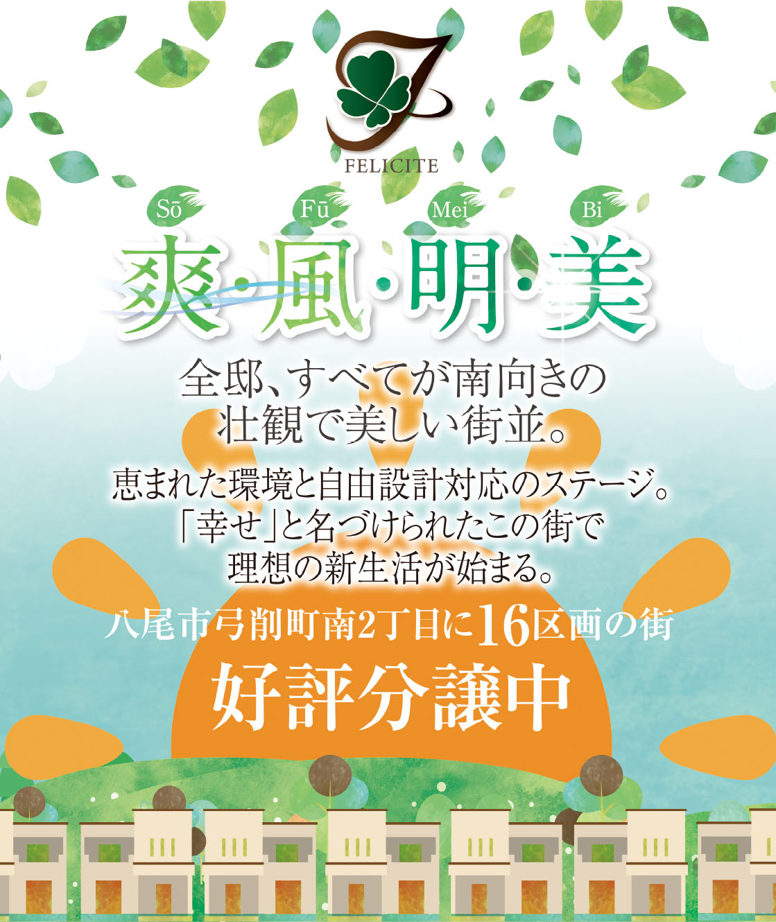 全16邸がすべて南向きの美しい街並設計のステージ「フェリシテ弓削町南」。フェリシテとは、フランス語の「幸せ」felicite(フェリスィテ)の意味。