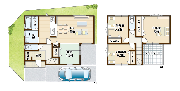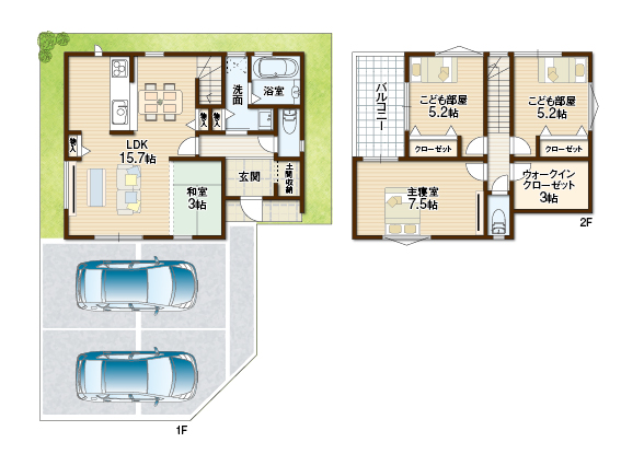 車が2台駐車可能なスペースを確保しました。仕事用とプライベート用など様々な用途に活躍し、利便性が高まります。