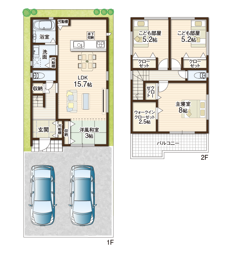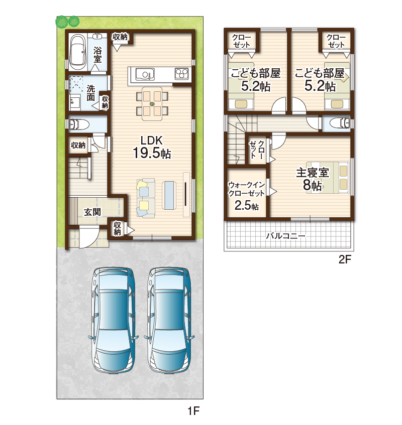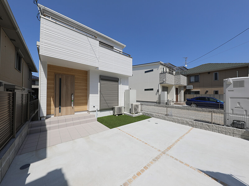 ゆとの敷地を活かし、駐車2台可能なスペースを確保。駐車しやすい横並びのガレージで出し入れも楽々です。