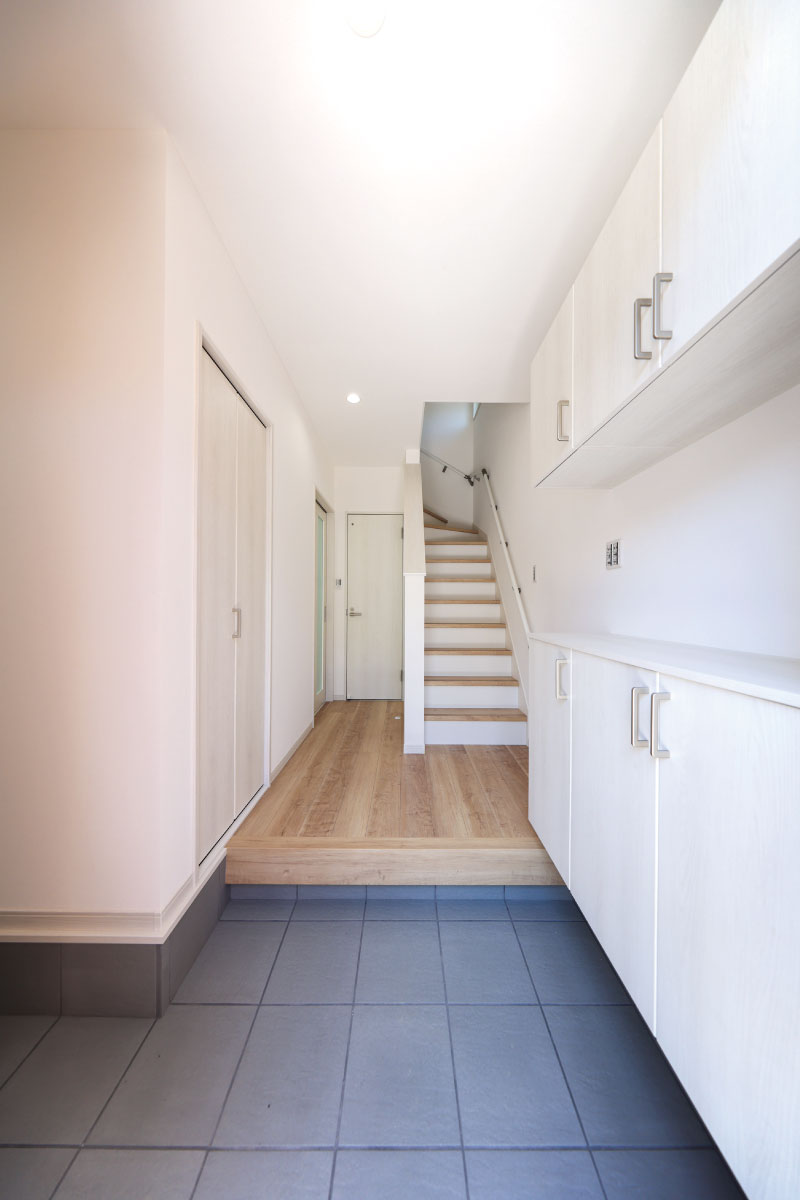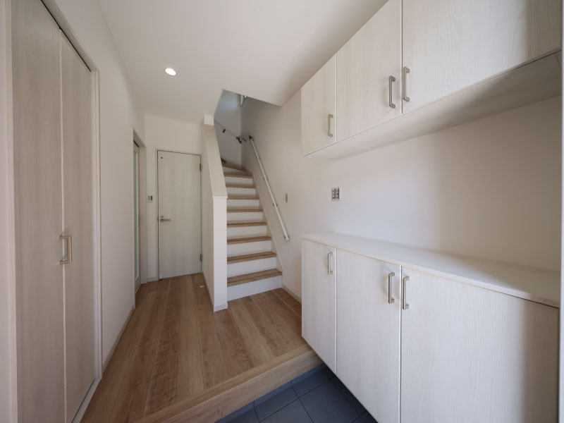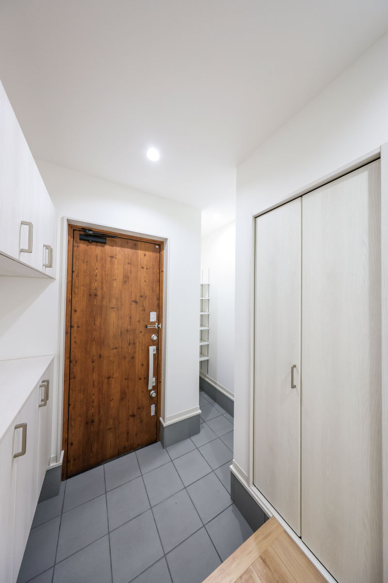 土足で出入り可能な土間収納に加え、コートや鞄などを収納できるクローゼットを設けた広々玄関です。