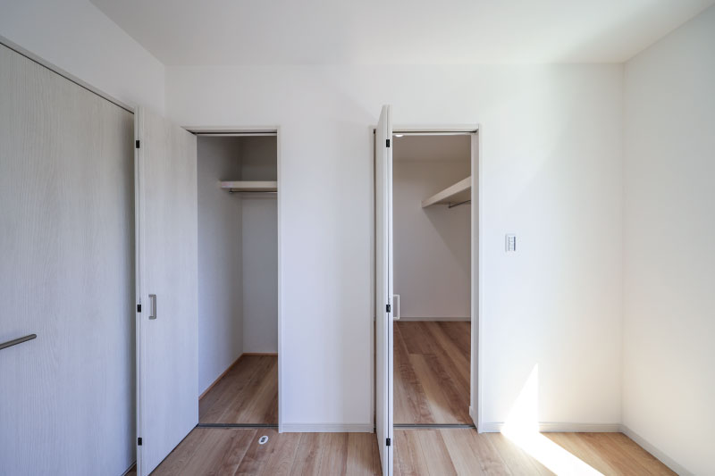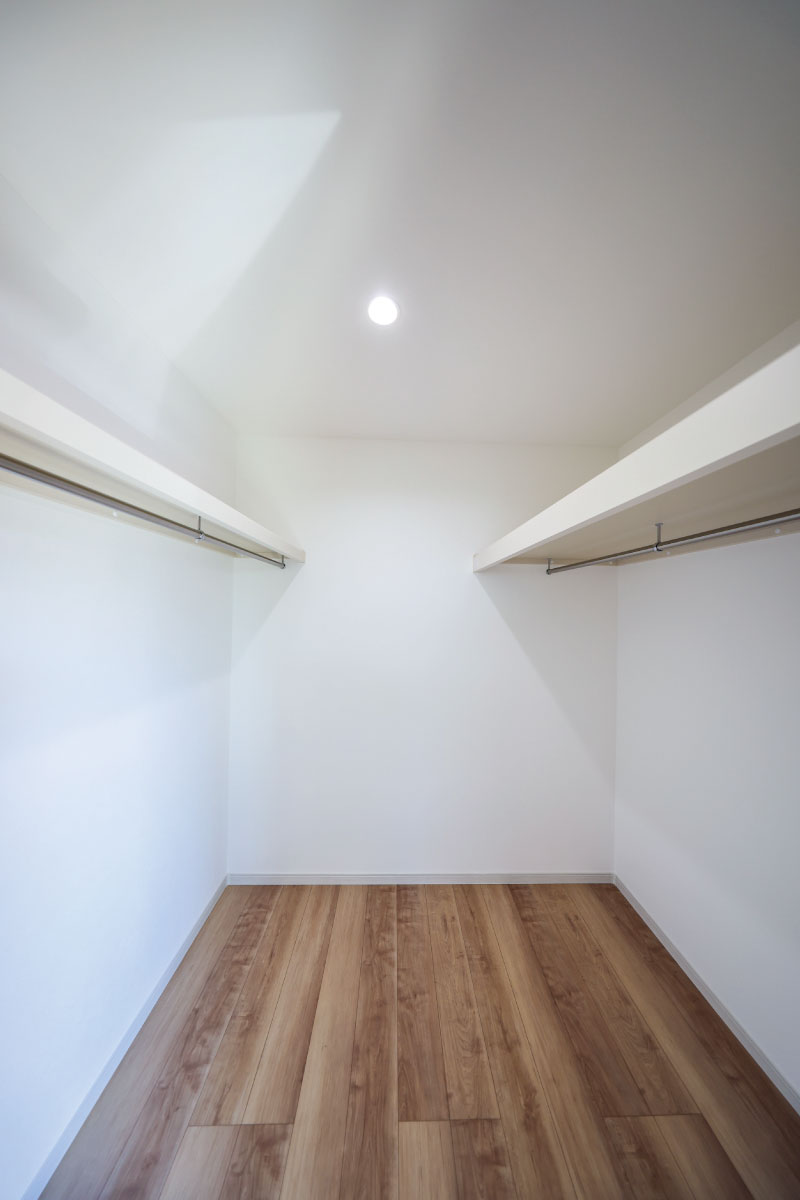 主寝室に設けた3.7帖のウォークインクローゼットにはご夫婦の衣類以外にも季節物の家電等もまとめて収納できます。