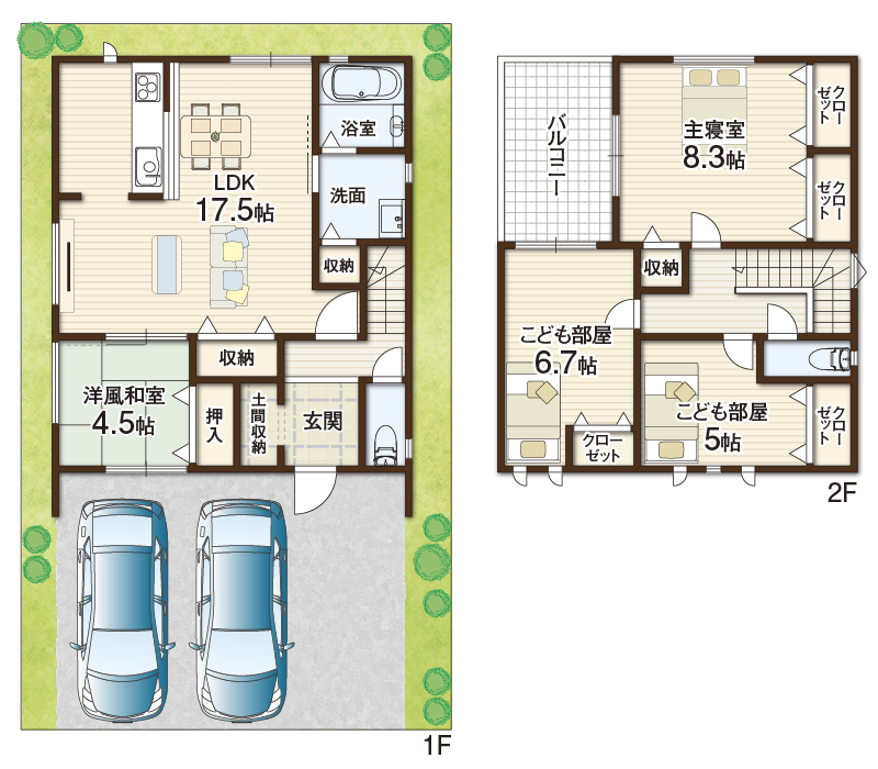 車の出し入れがしやすい横並びの駐車スペース。ご夫婦で車の使い分けができ、アクティブに活動できます。
