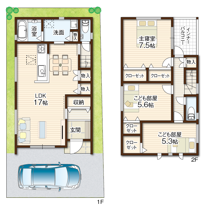 玄関ホール収納をはじめ、リビング収納や洗面収納など散らかりがちな場所に収納を設けスッキリ片付く設計です。