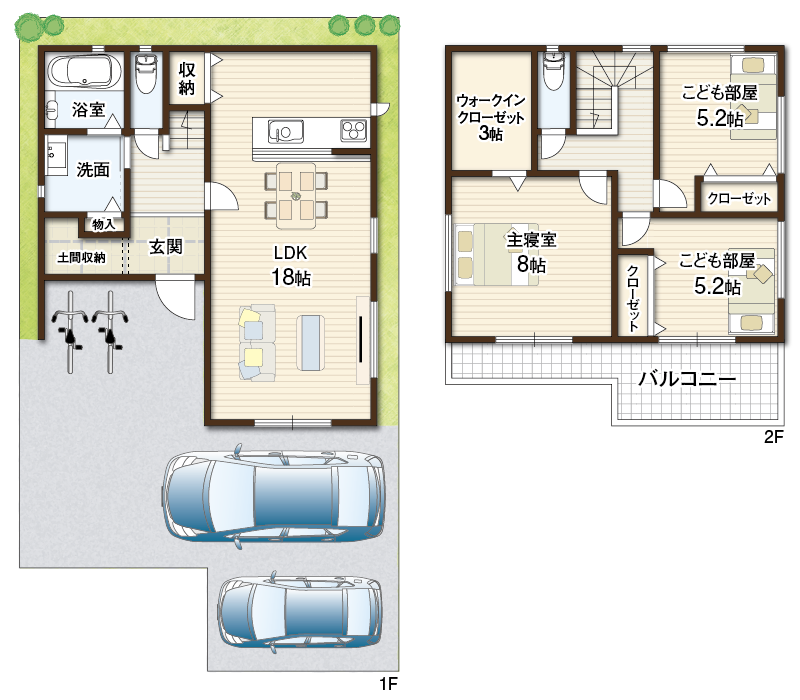 車の出し入れがしやすい横並びの駐車スペース。ご夫婦で車の使い分けができ、アクティブに活動できます。